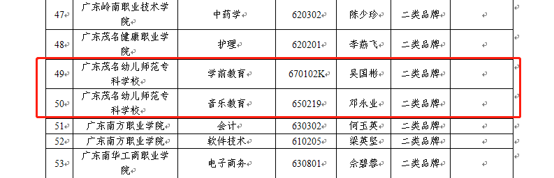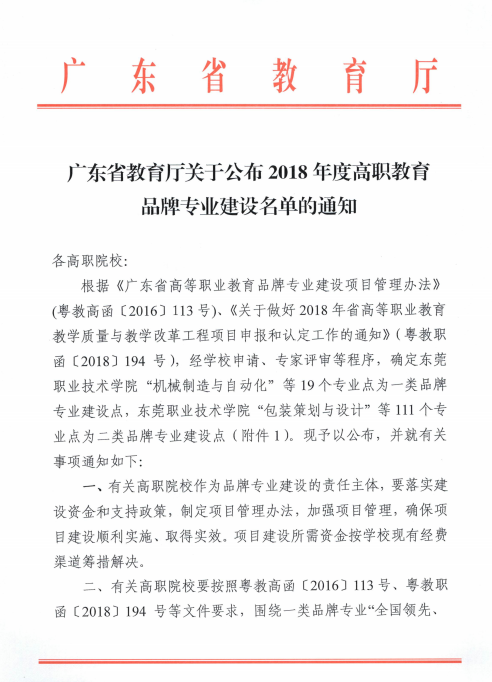 根據(jù)《廣東省高等職業(yè)教育品牌專業(yè)建設(shè)項目管理辦法》 (粵教高函〔2016〕113號)、《關(guān)于做好2018年省高等職業(yè)教育教學(xué)質(zhì)量與教學(xué)改革工程項目申報和認(rèn)定工作的通知》(粵教職函〔2018〕194 號),經(jīng)省廳組織專家評審,我校學(xué)前教育專業(yè)、音樂教育專業(yè)被確定為廣東省高職教育二類品牌專業(yè)。