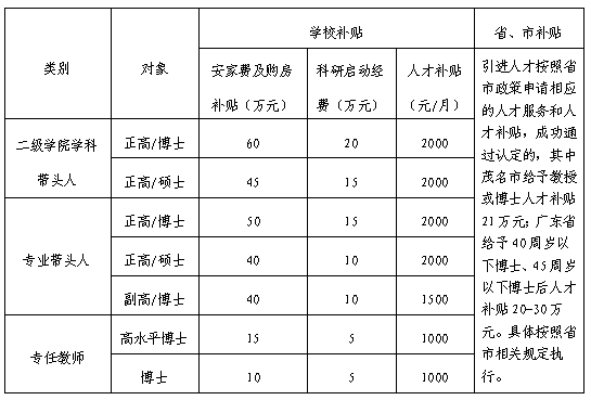 獲聘人員為茂名市事業(yè)編制人員,執(zhí)行茂名市規(guī)定的薪酬待遇,并享受學(xué)校人才引進(jìn)補(bǔ)貼。符合茂名市高層次人才條件的,學(xué)校協(xié)助申請辦理茂名市高層次人才認(rèn)定,通過認(rèn)定的,同時享受市人才補(bǔ)貼。已在本校工作的校內(nèi)培養(yǎng)博士或正高人才應(yīng)聘,不再享受學(xué)校的安家費及購房補(bǔ)貼待遇。