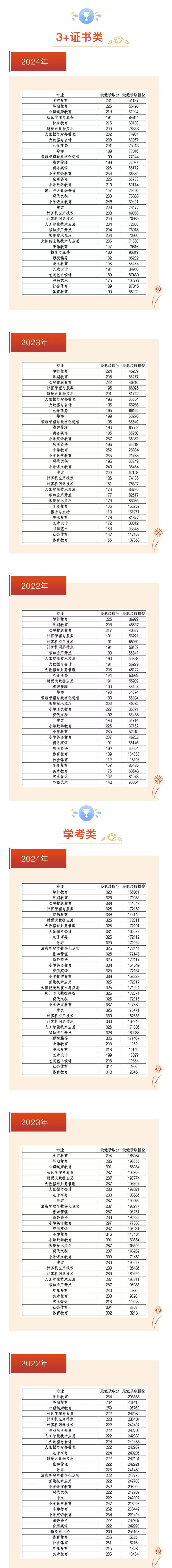 為了幫助考生更好地填報(bào)我校志愿,現(xiàn)將我校往年春季高考“3+證書類”、“學(xué)考類”各專業(yè)錄取最低分及排位情況提供給各位考生參考: