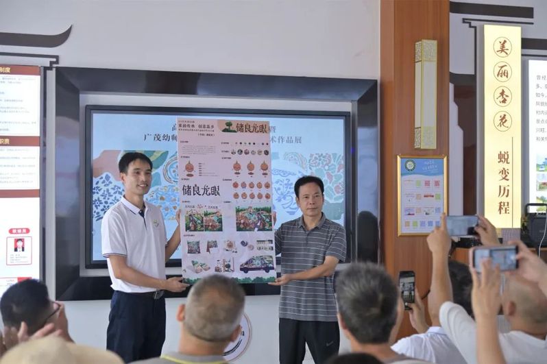 上午 11 時許,開幕式在分界鎮(zhèn)儲良杏花村黨群服務(wù)站拉開序幕。廣茂幼師美術(shù)學(xué)院副院長朱錦賢詳細闡述了舉辦此次展覽的重要意義,強調(diào)其核心是為鄉(xiāng)村振興事業(yè)服務(wù)。梁武則對廣茂幼師表示誠摯感謝,并期待與該校師生開展更深層次的合作。現(xiàn)場,莫明波代表我校向分界鎮(zhèn)儲良村捐贈了儲良村視覺形象 LOGO、系列文創(chuàng)作品及龍眼題材畫作,這一舉措標志著校地雙方在鄉(xiāng)村美育建設(shè)領(lǐng)域邁出了堅實一步。