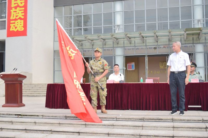 (黨委書(shū)記余義才為軍訓(xùn)團(tuán)授旗)